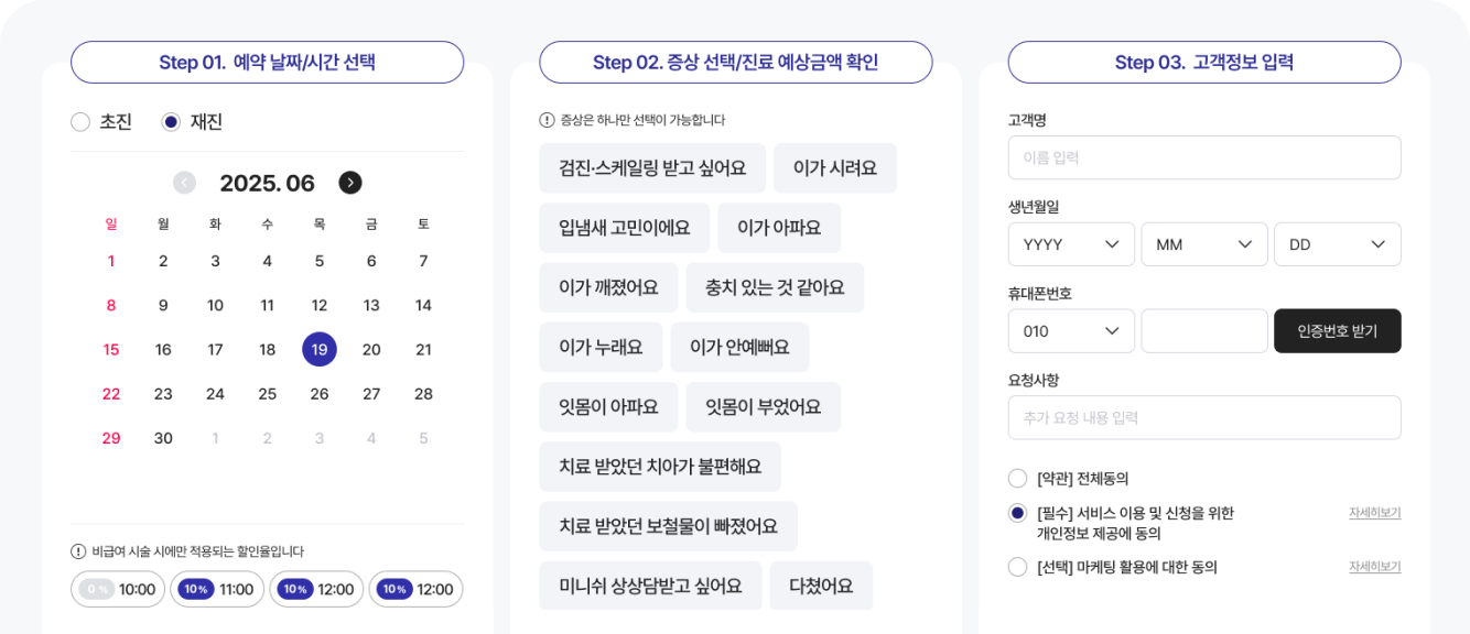원하는 날짜, 시간을 선택 후 진료 예약을 진행합니다.
